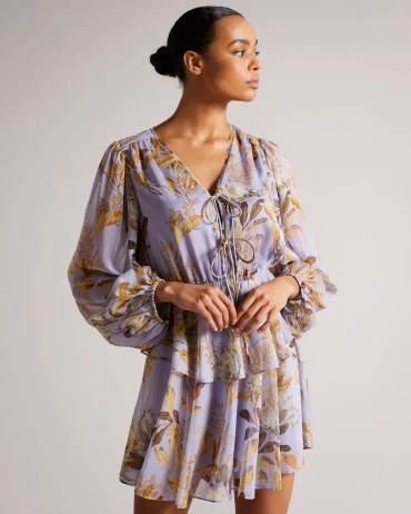 Ted Baker DEYJA Graduated Midi Dress With Ruched Puff Sleeves, Purple/Multi