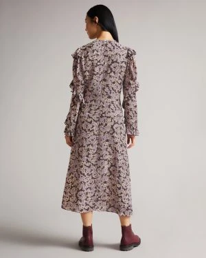 Meet HAALIE, a sweeter take on the day-to-night dress. Swoon over its vintage-inspired details like ruffled frills, lace-up front, and pretty lilac print. Try teaming with stompy boots for a modern take on a classic 90s-inspired look, or with metallic heels for party glamour.