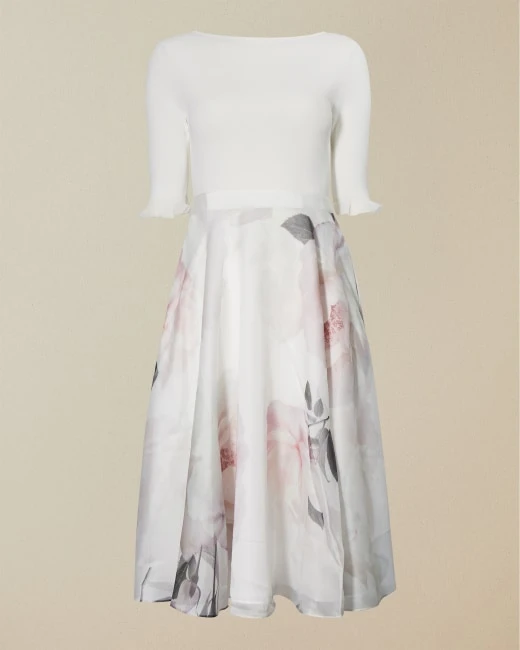 Get set for the races and other special occasions with the elegant ivory and pink Iline dress from Ted Baker. Featuring a plain top with flattering frilled sleeves for arm coverage, it comes into bloom with its full midi skirt boasting the Bouquet print – perfect for twirling.