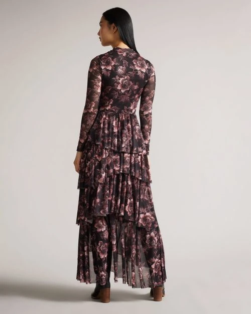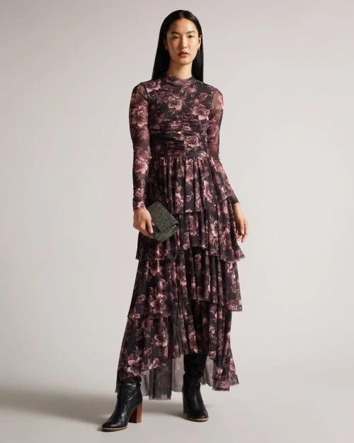 Ted Baker DEYJA Graduated Midi Dress With Ruched Puff Sleeves, Purple/Multi