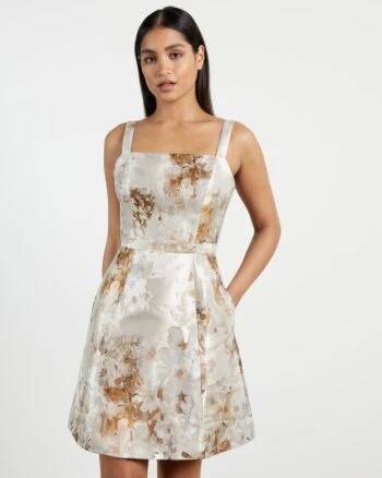 Mini with shape. Mould yourself in JONIEE, our figure flattering, jacquard Vanilla dress. The adjustable straps give you the scope you need to adjust the dress to fit you specifically, while the mini length and tailoring give you a structured silhouette. Now, you just need to choose a pair of strappy sandals to match.