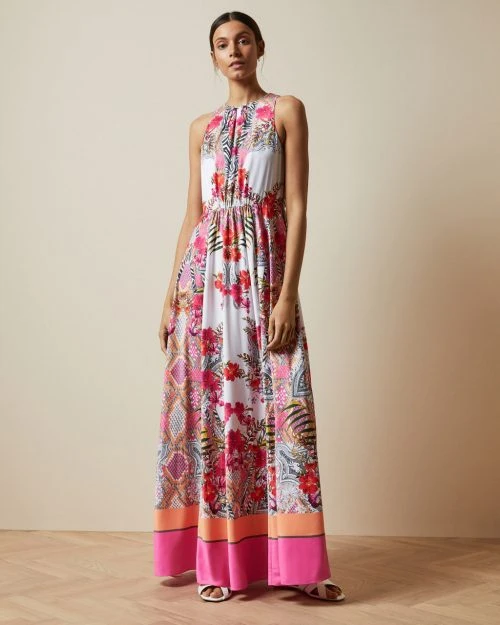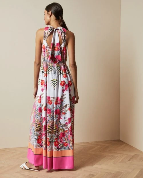 Eye-catching and oh-so-striking, the gorgeous pink and ivory Laniah maxi dress is the perfect addition to your event-ready wardrobe. Colourfully decorated in the Samba print, the bow detail on the back adds a refined edge to this piece – ideal for showing off an up-do.