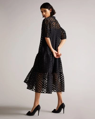 What’s trendy, elegant, and spotty all over? It’s NELANIE, of course. This organza midi dress is beautifully detailed from top to bottom, with a collar, puff sleeves and an oversized shirt dress style. Perfect for parties, cocktails and formal events, this dress will make a statement wherever you go.