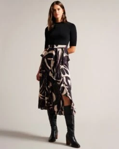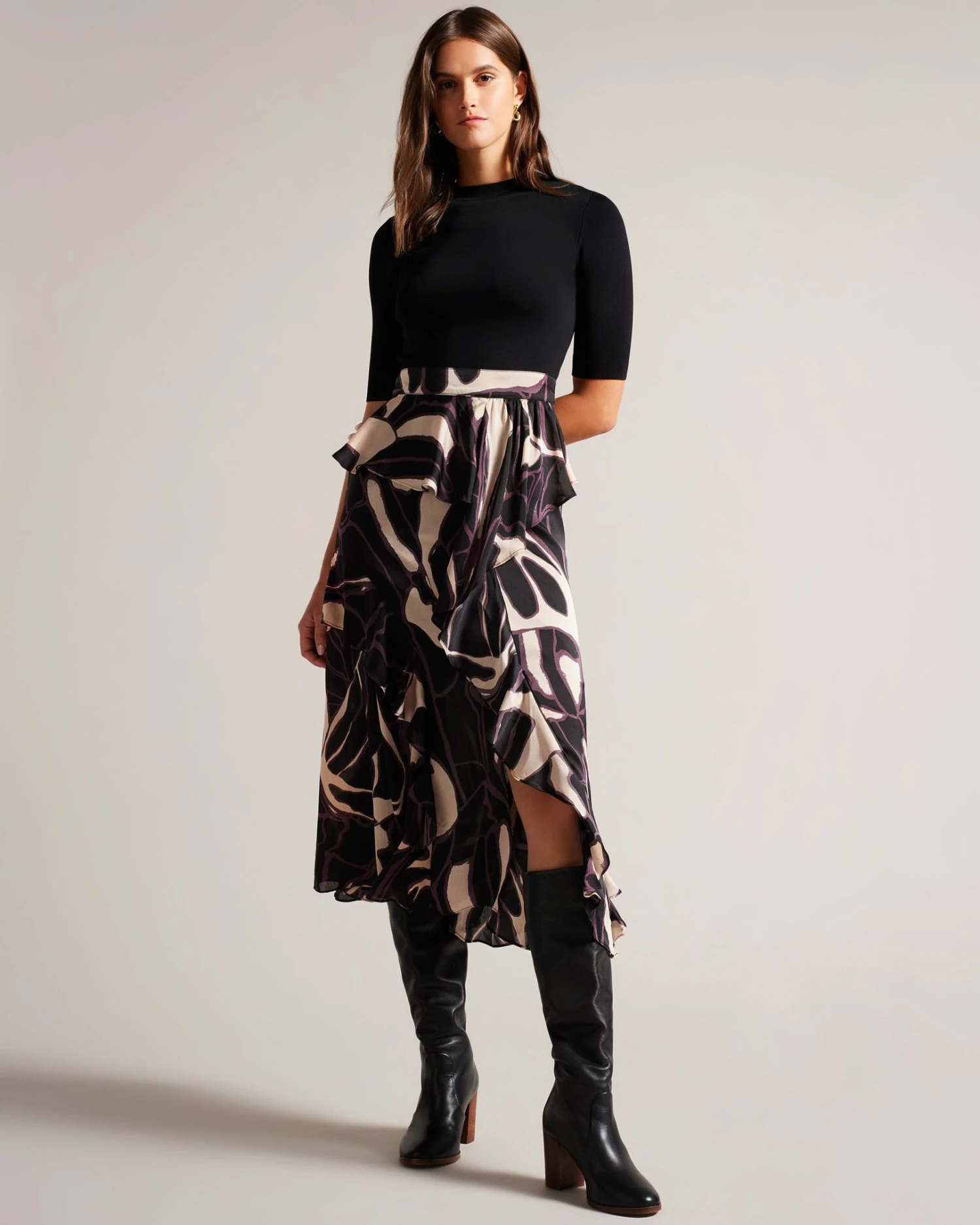 Comfort and style combine in SEREPHA. Featuring a knitted bodice and floaty satin skirt, this midi dress is the best of both worlds. Easy to style and even easier to love, this dress will turn heads from the office to bottomless brunch.