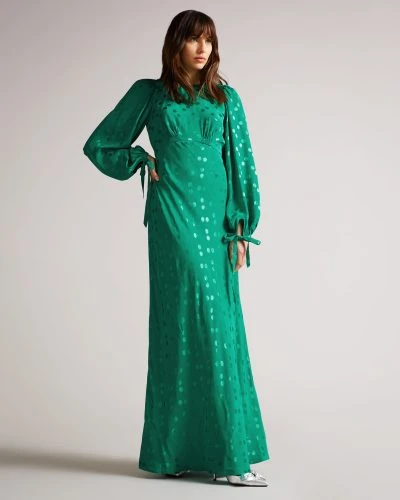 Steal the show in TALLYIA. With a draping fit and exaggerated sleeves, this dress is a show stopper. Monochromatic polka dots offer a subtle texture to this dress that will catch the light as you dance the night away.