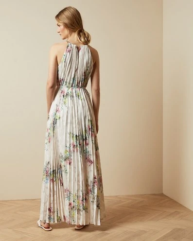 Say yes pleats to stunning ivory Threlin pleat dress from Ted Baker and be the belle of the ball at your next wedding. Brightened up with the subtly neon florals of the Pergola print, the dip hem dress lends a rather elegant finish to this dress, elevated with the chain halter neck.
