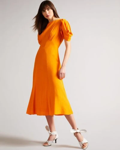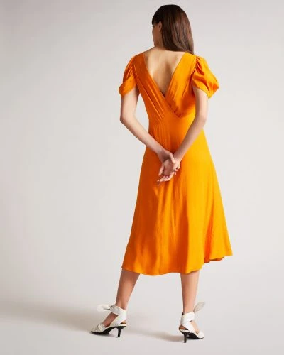 Add some elegance with the TULIPI tea dress. With its draped sleeves, textured fabric and deep V-back, it gives 1940s glamour a very contemporary edge. Toughen it up with stompy boots, or channel pure romance with a pair of classic heels.