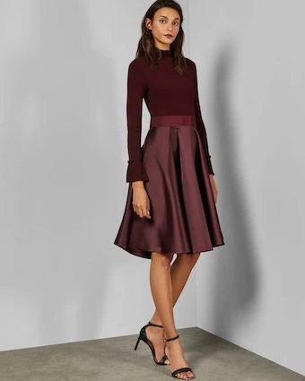 Strut through any formal occasion with the vibrantly stylish maroon Zadi Frill neck full skirt dress from Ted Baker. This utterly elegant design features a long-sleeved top with a full skirt.