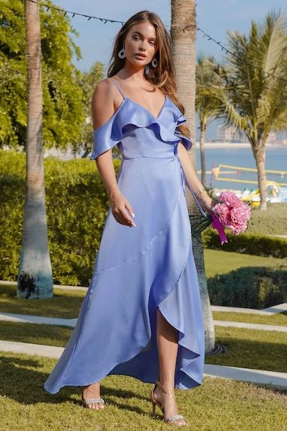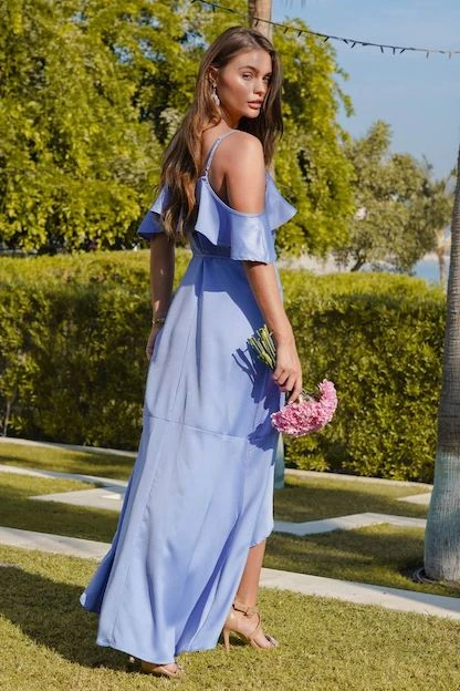 TFNC Wedding Guest Dress – Cold-shoulder design – Hi-Low Maxi Length – V Neckline Care: 100% Polyester. Hand wash Models height is 5’10 Model is wearing size 8 UK
