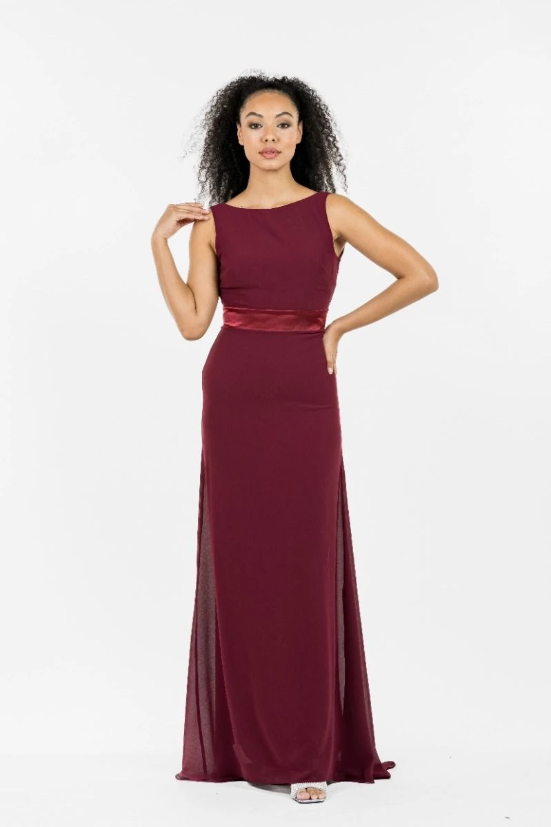 The beautiful burgundy Halannah bridesmaid maxi dress from TFNC features a boat neckline, a figure skimming silhouette and a ribbon waist tie. Perfect for bridesmaids.