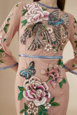 Coast Lisa Tan Premium Hand Embellished Midi Dress, Blush Pink/Multi
