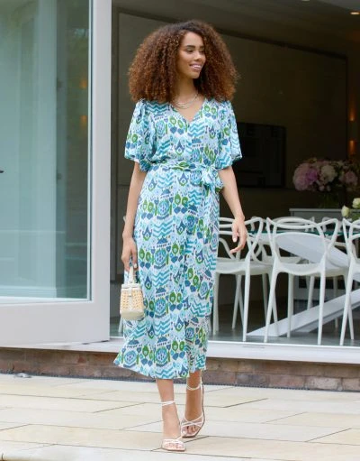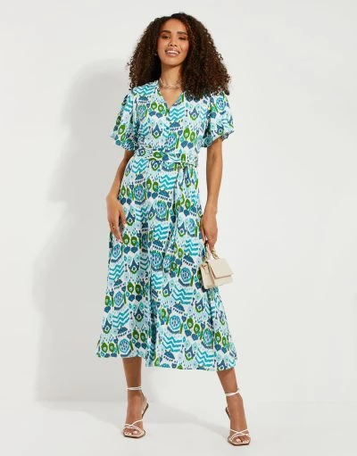 In a blue Aztec pattern, it’s serving tropical vibes with a touch of elegance. With frill sleeves, V-neck and a fit and flare shape, this is the perfect piece for hot summer nights. Tie it as you wish at the waist with the matching tie belt.