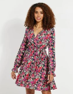 This mini dress is in a wrap style with a self tie belt so it can be tied to the middle, off-centre or back as desired. With a full skirt, elasticated sleeves with a peplum frill, the elasticated waist make it perfect for easy wear.