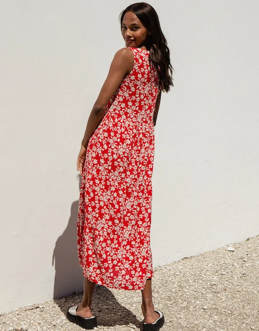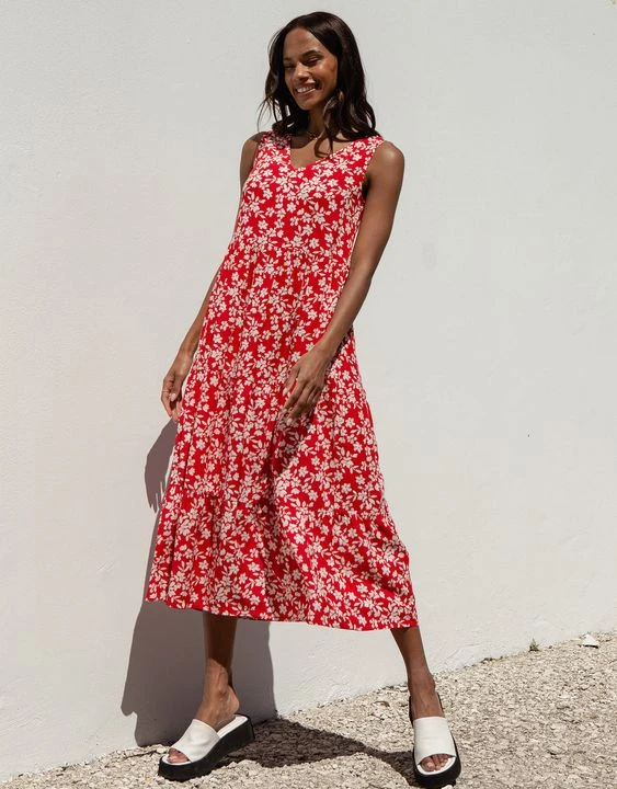 With a v neck and seamlines to create tiering, this sleeveless midi dress has an overall A-line shape and falls at a midi length for that feminine flow we crave in the summer months.