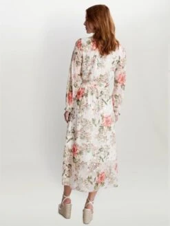 Gina Bacconi Jodette Shirred Neck Print Dress, Cream/Coral/Multi