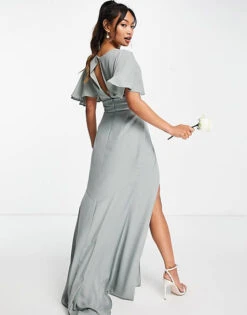 ASOS DESIGN Bridesmaid Flutter Sleeve Maxi Dress Satin Wrap Skirt, Olive Green