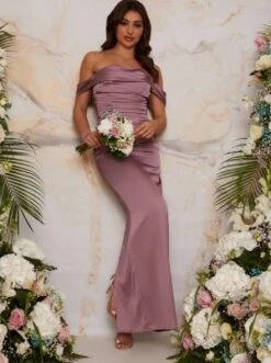 Chi Chi Bardot Ruched Satin Bridesmaid Maxi Dress, Lilac/Purple