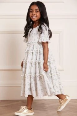 Needle & Thread Needle & Thread Bijou Rose Cotton Smocked Girls Dress, Ivory/blue