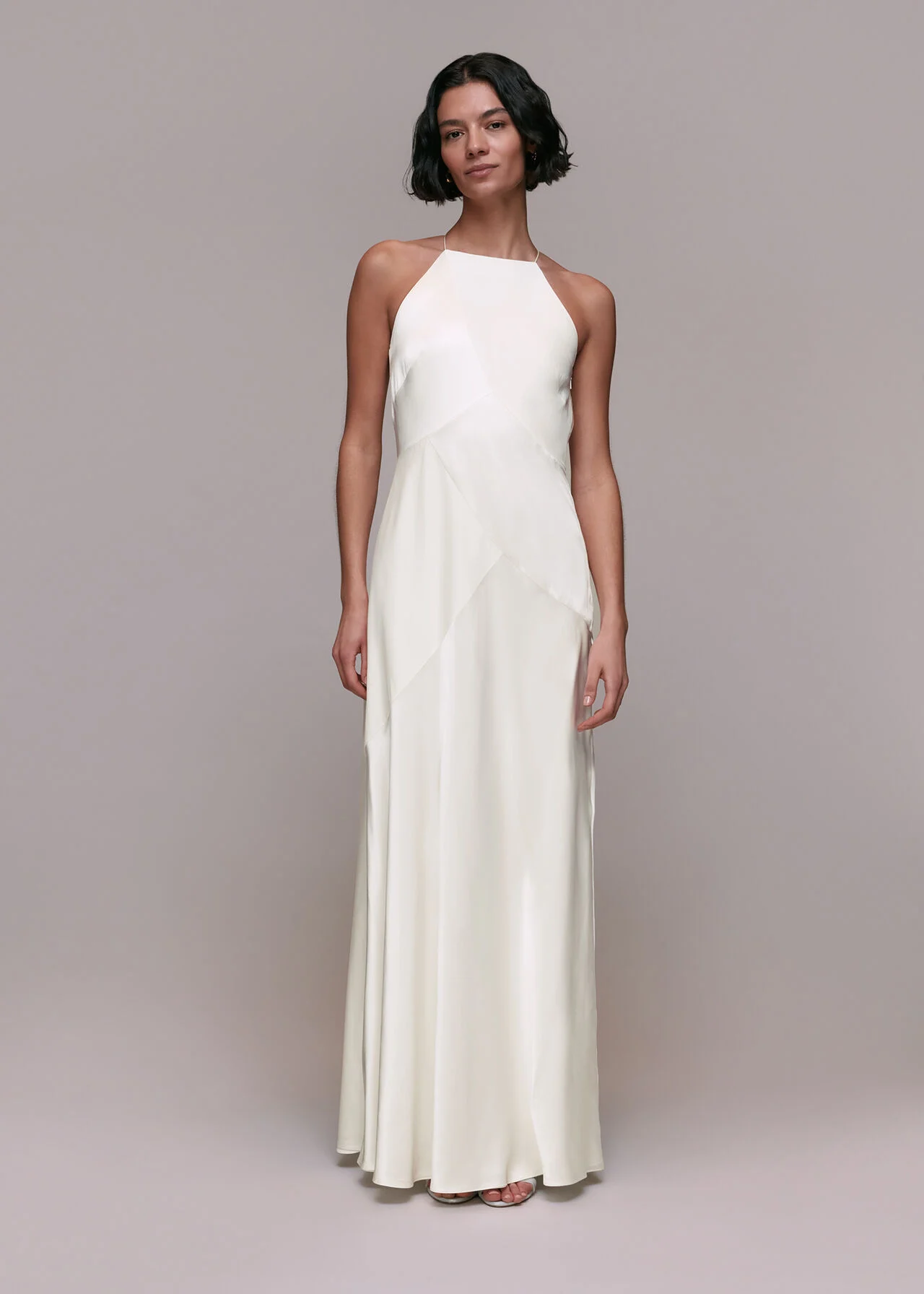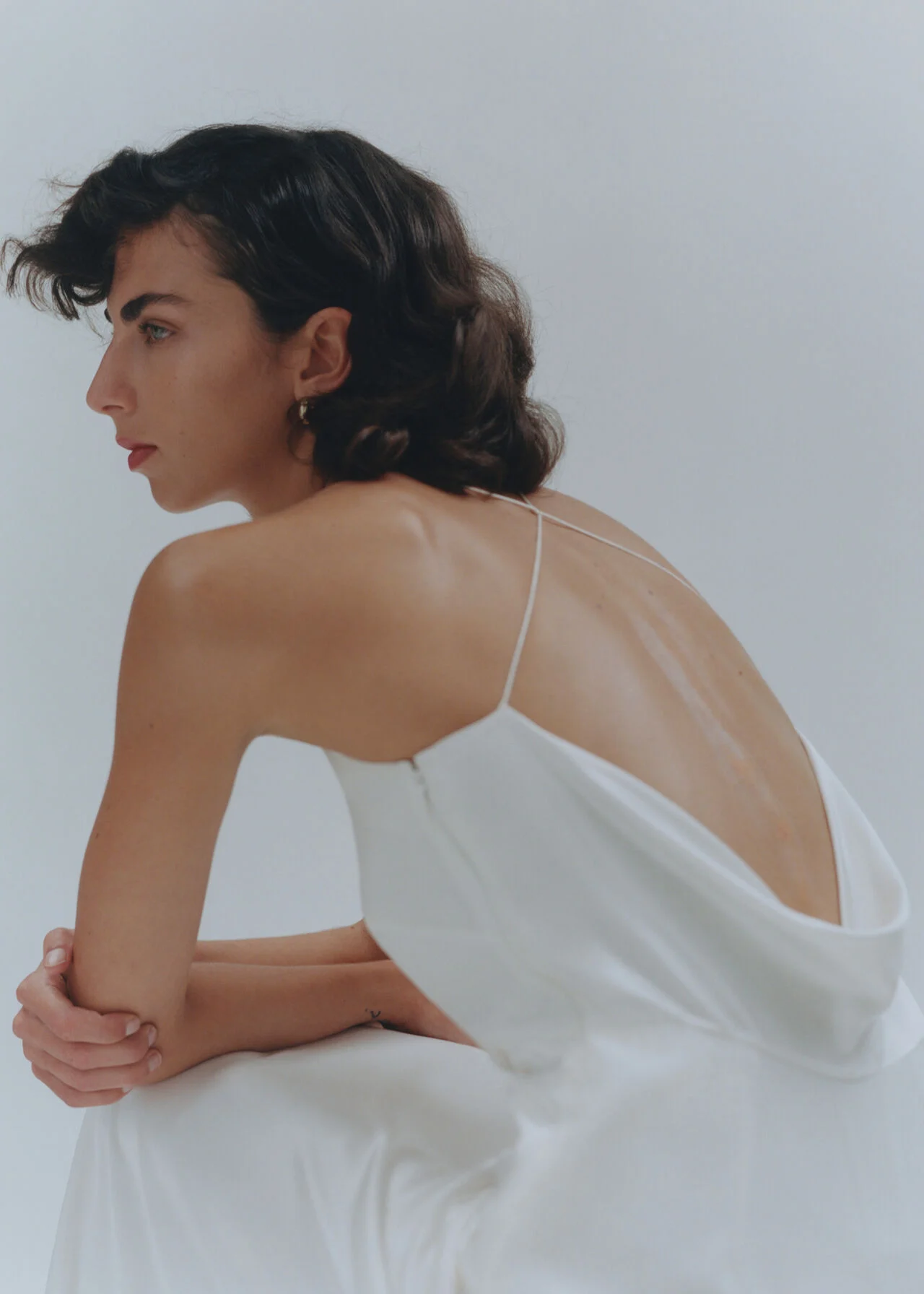 Our Eileen Silk will command everyone’s attention. It’s fashioned in an utterly flattering silhouette with silk patchwork details and a modern square neck. Designed with sophisticated rouleau straps and a soft cowl neck back, it will command attention at every ceremony..