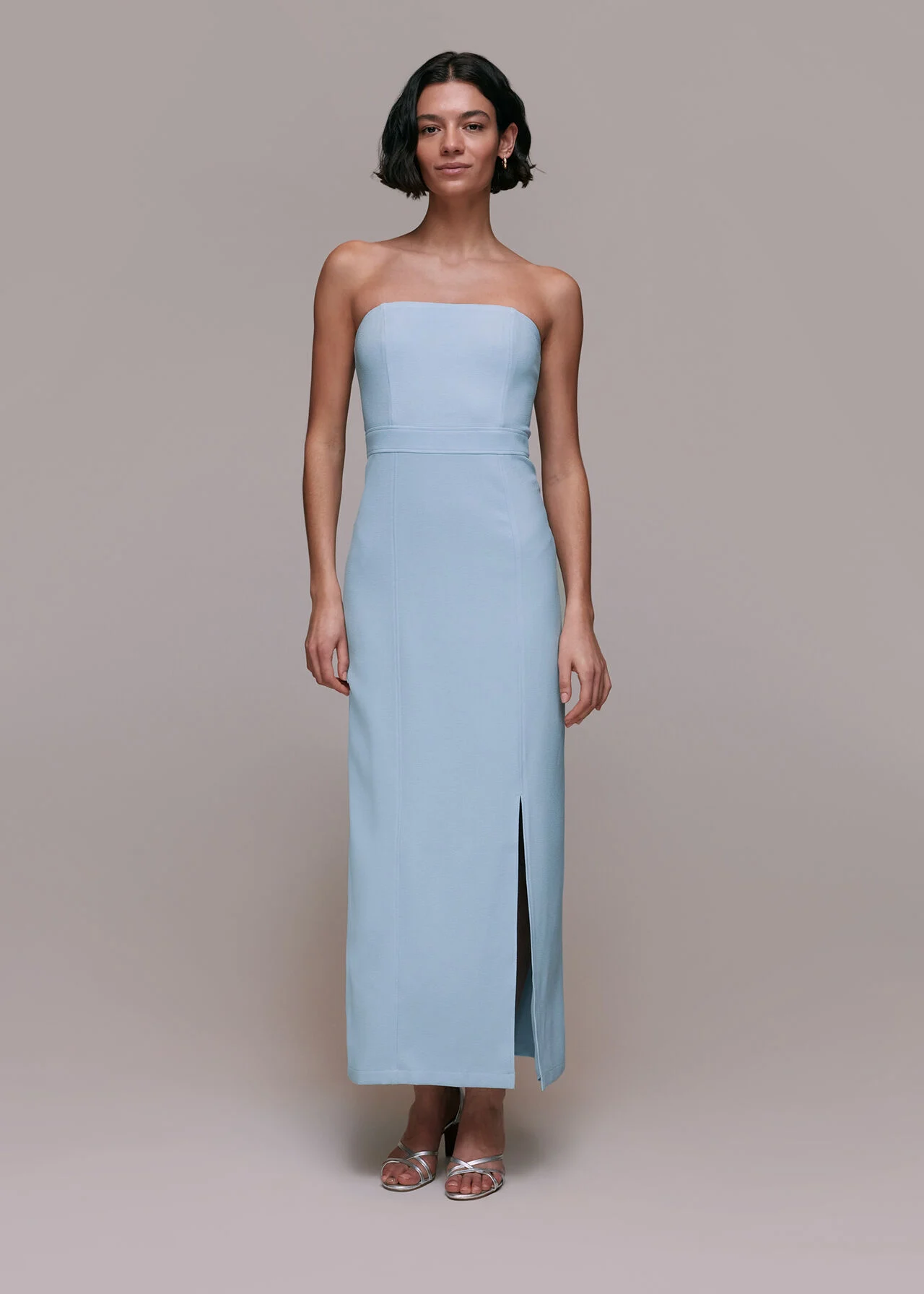 Designed in a simple, strapless style, the Gemma dress comes in a fitted silhouette with a subtle slit up the leg. The pale blue feels timeless and wearable, offering a versatility that means you can style it long beyond wedding season.