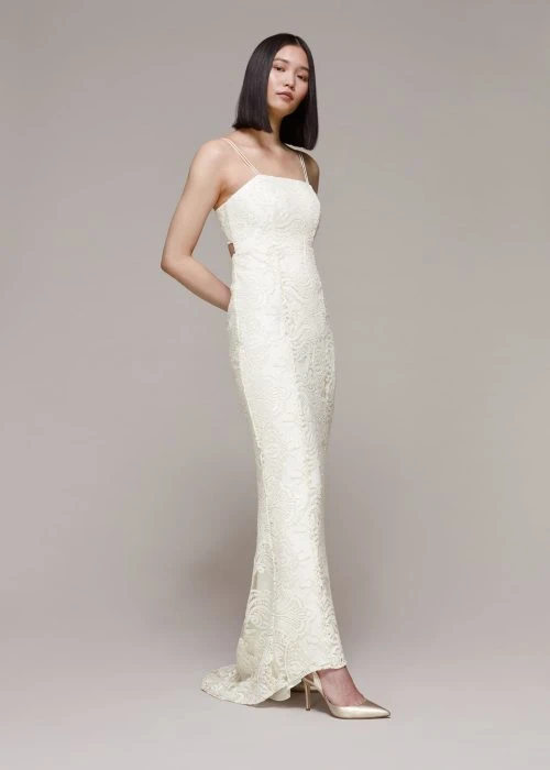 Swathed in glittering sequins, our Lorelei gown will command everyone’s attention. It’s fashioned in an utterly flattering silhouette, and details such as the double shoulder straps and cut-out back add further intricacy to the design. The train is ultra minimal on this style, making it ideal for dancing the night away in.