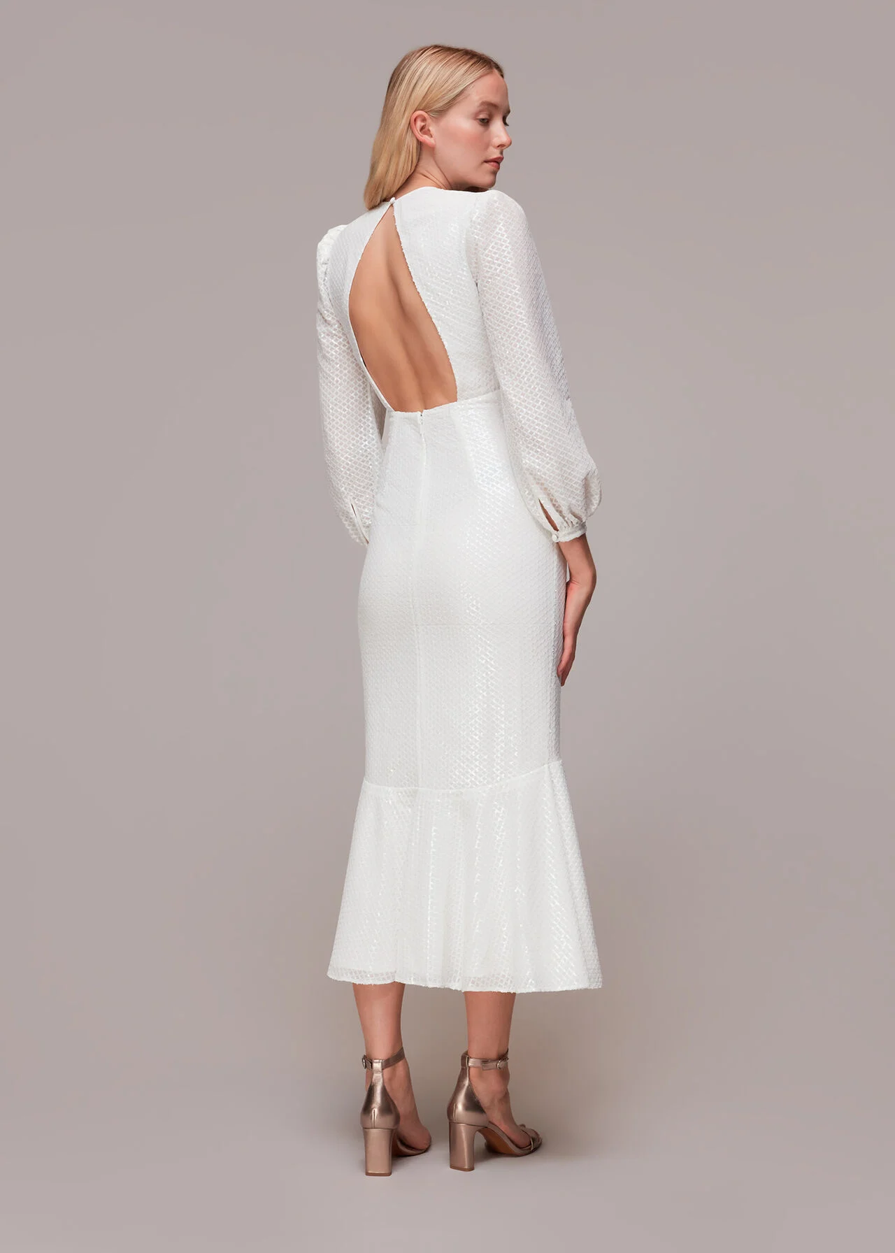 Crafted in an elegant ivory hue, our Loretta dress offers an elevated look for modern weddings. Featuring a puff sleeve,Tier seam and cut out detail, the silhouette is fitted through the body with a flare detail at the hem.