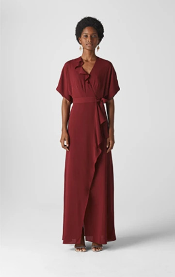 Whistles romantic burgundy Nova Frill Wrap Maxi Bridesmaid Dress features a V frill neckline, a cinched in waist and exquisite relaxed skirt. A modern choice perfect for a wedding guest or bridesmaid this season. Team with heels and a slim clutch for a beautiful look.